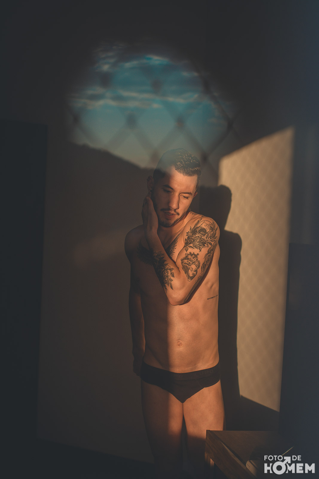 Rafael tem 23 anos e mostrou-se bastante tranquilo com a nudez. As fotos foram feitas numa manhã de sábado, bem cedinho. Tivemos a sorte de pegarmos um céu sem nuvens, o que poderia ser irrelevante já que a sessão foi toda feita dentro do meu apartamento. Ocorre que o Sol da manhã chegou forte e criou um excelente contraste de luz e sombra, que foi a tônica do ensaio.