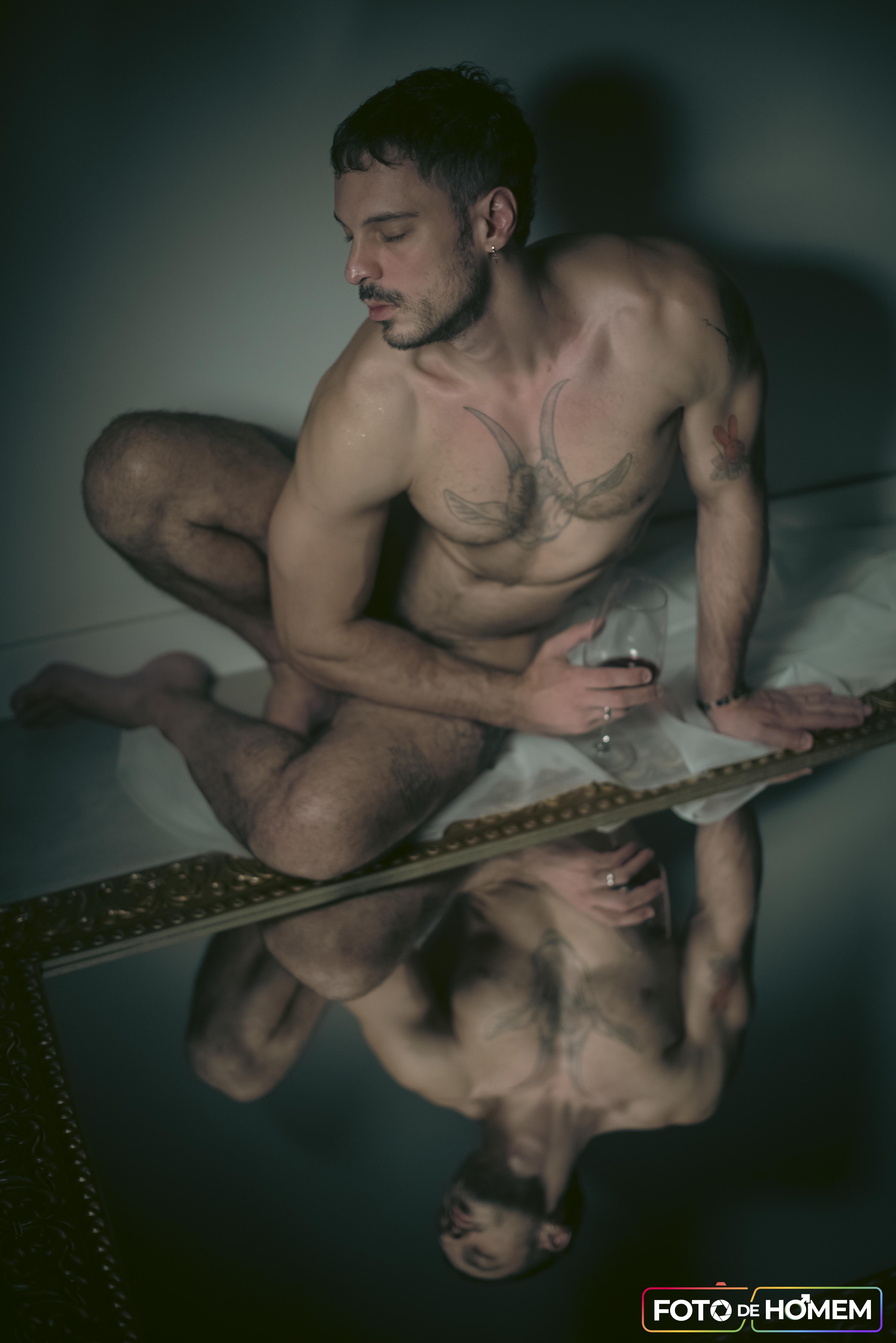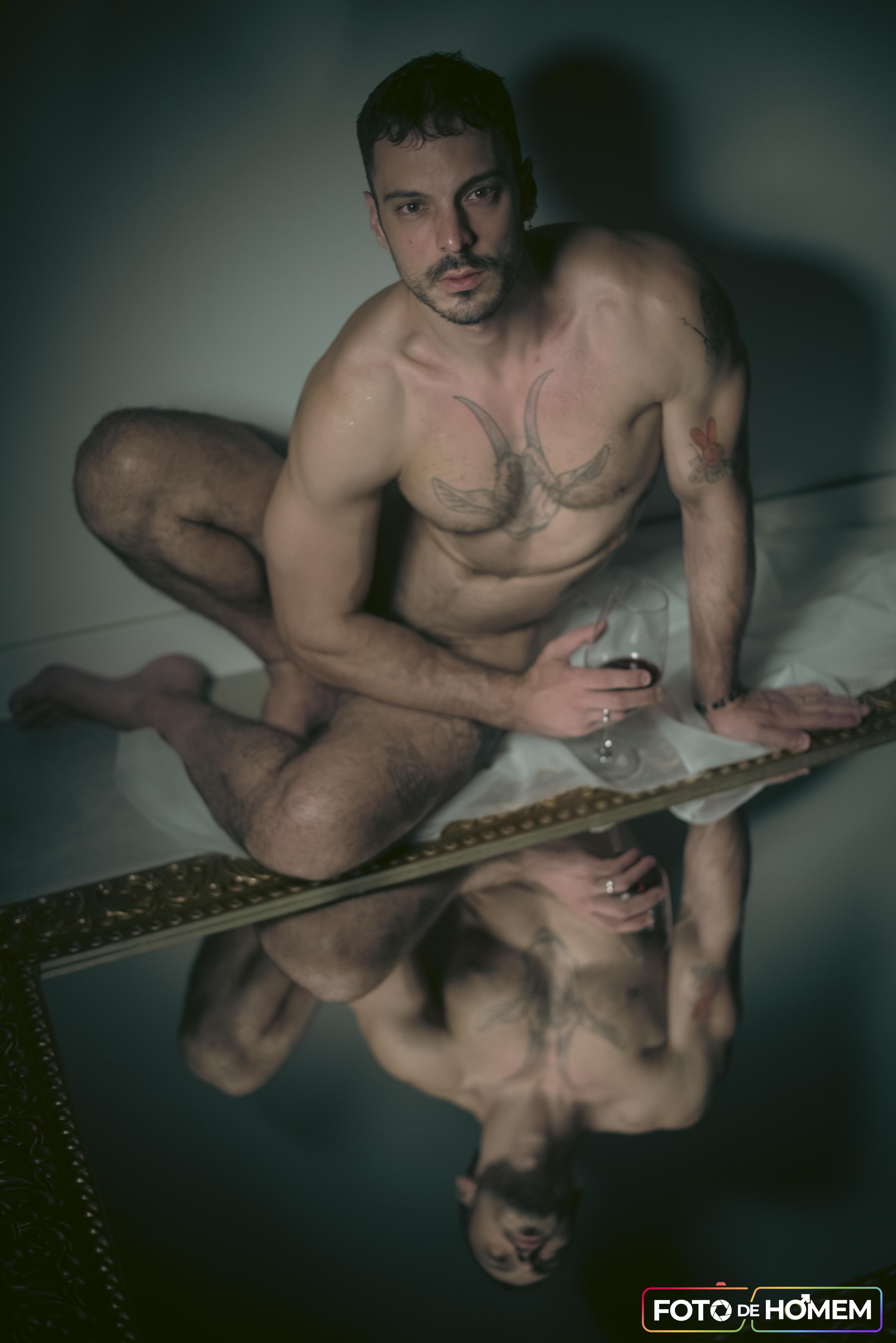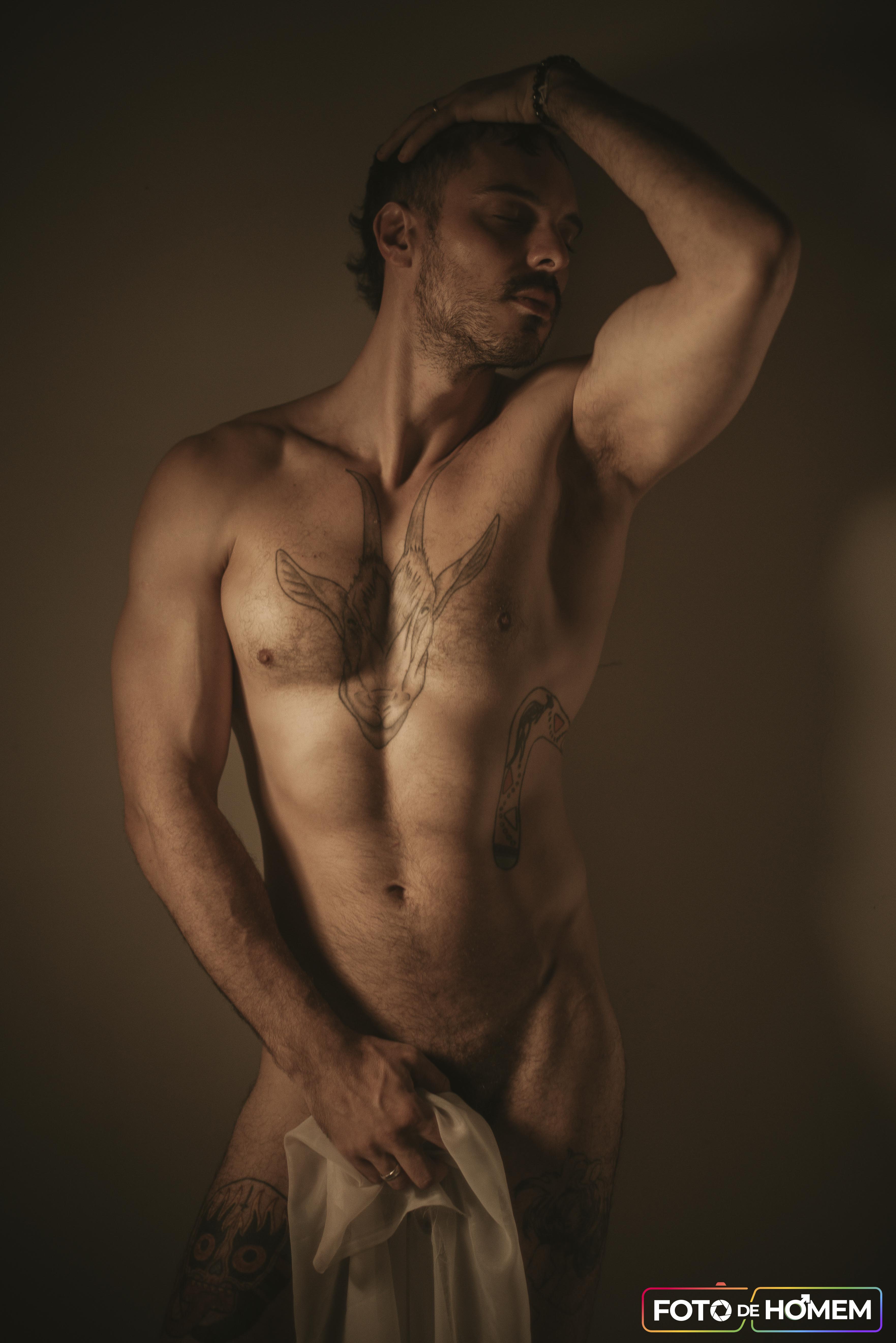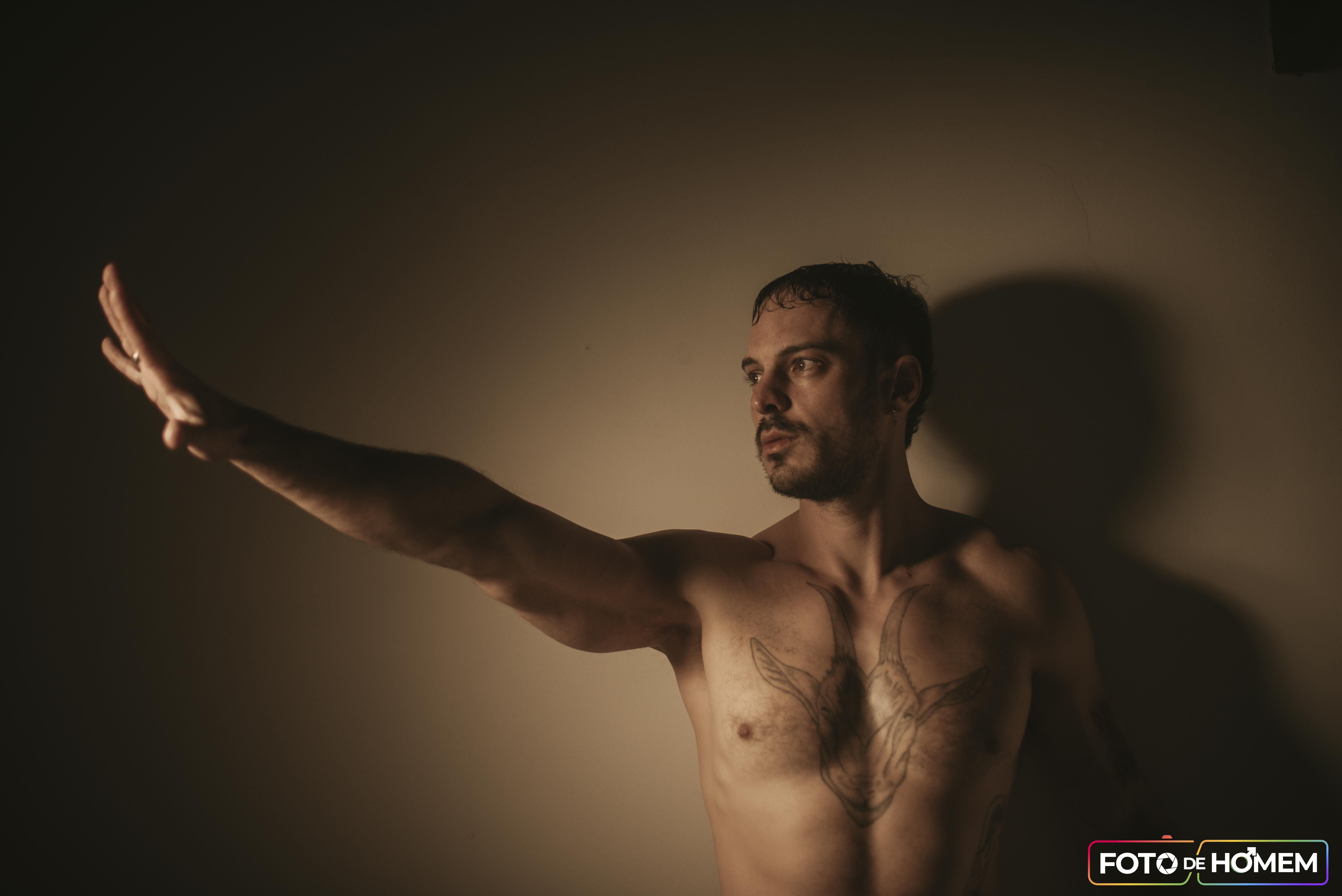 As fotos foram realizadas na casa dele e da esposa, em Joinville (SC), em um ambiente íntimo, confortável e cheio de personalidade. Esse contexto ajudou a deixar o ensaio ainda mais autêntico, valorizando não apenas o corpo masculino, mas também a história, a segurança e a entrega de quem entende a nudez como uma expressão sincera de si mesmo.